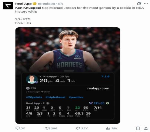 克努佩爾再度創(chuàng)造多項(xiàng)紀(jì)錄:1.他比肩新秀賽季的邁克爾-喬丹,拿到一樣多的20分+真實(shí)命中率65%的場(chǎng)次;