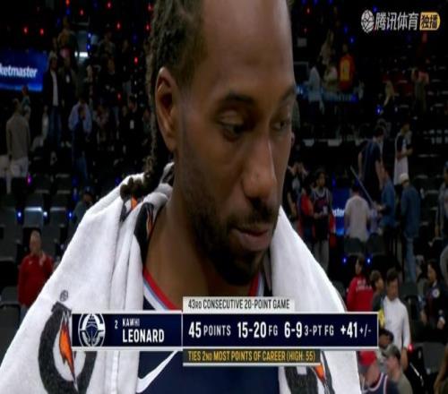 31分鐘暴砍45分5籃板5助攻2搶斷,投籃20中15,三分球9中6,罰球10中9,真實(shí)命中率高達(dá)92.2%,正負(fù)值高達(dá)+41,是快船隊(duì)史最高效的一場(chǎng)45+