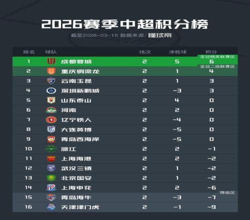 北京時(shí)間3月15日,中超第2輪全部戰(zhàn)罷。在兩支球隊(duì)負(fù)分清零的情況下,積分榜也進(jìn)一步發(fā)生了變化。