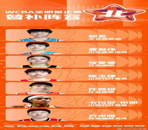 北區(qū)替補(bǔ):鄭茗(北京)、曹君偉(山東)、張曼曼(江蘇)、陳玉婕(山西)、許晨妍(江蘇)、卡拉尼-布朗(山西)、方卓雅(陜西)