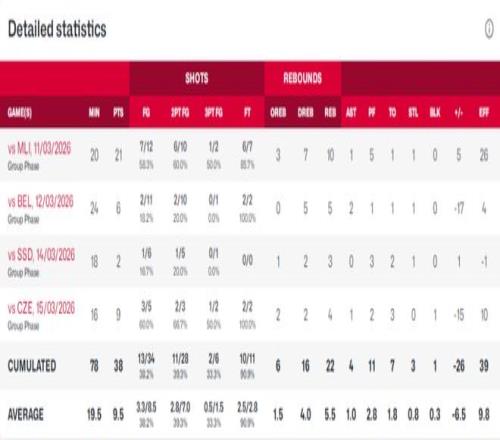 反觀李月汝在女籃世預(yù)賽前4場的表現(xiàn),她場均得到9.5分5.5籃板1助攻2.8犯規(guī),但投籃命中率只有38.2%,其中三分命中率也只有33.3%。