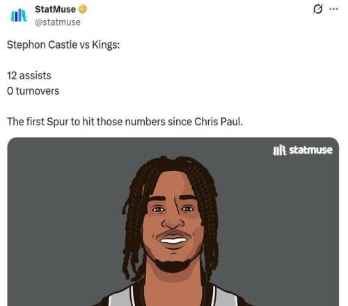 7名得分上雙的球員中還不包括卡斯?fàn)枺緢鏊?中1失準(zhǔn),但狂送12次助攻并且一次失誤都沒有,憑借這樣的表現(xiàn),卡斯?fàn)柍蔀楸A_之后馬刺首位單場做到12助0失誤的球員。