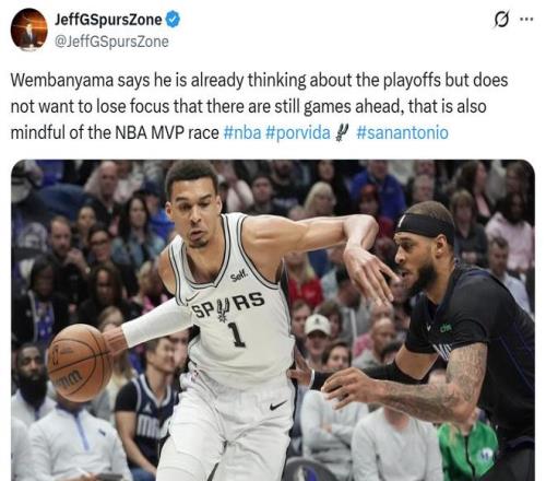 賽后文班亞馬就公開表示自己已經(jīng)開始考慮季后賽了,但他不想因此而分心,畢竟還有比賽要打,同時(shí)自己也很關(guān)心MVP的歸屬。