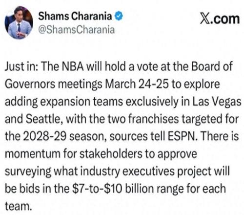 來(lái)自Shams Charania的最新爆料,NBA計(jì)劃在下個(gè)月的理事會(huì)會(huì)議上,正式討論擴(kuò)軍事宜;而候選城市也很直接,分別是拉斯維加斯和西雅圖。