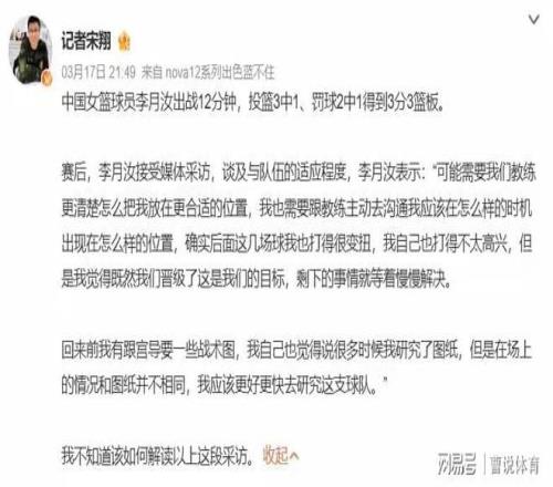 情況不妙!李月汝直言:教練不理解,我打得不太高興,宮魯鳴被質(zhì)疑!萬眾矚目的女籃世預(yù)賽小組賽已經(jīng)打完,看了直播的球迷都知道,中國女籃小組賽5場比賽打完,拿到了四勝一負(fù)的成績,以小組第二名的成績晉級(jí)到女籃世界杯的16強(qiáng)。僅從拿到的成績來看,不得不說中國女籃,本次世預(yù)賽小組賽賽表現(xiàn)還是非常不錯(cuò)的,但是看了直播的球迷都知道,中國女籃本次世預(yù)賽小組賽打的其實(shí)并沒有那么好。