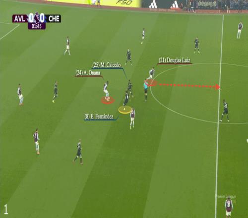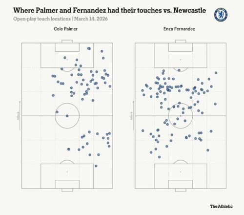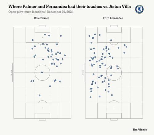 在那場對陣維拉的比賽中,他們各自影響力范圍有著自然的平衡,帕爾默主要在球場右側(cè)觸球,費(fèi)爾南德斯在左側(cè):