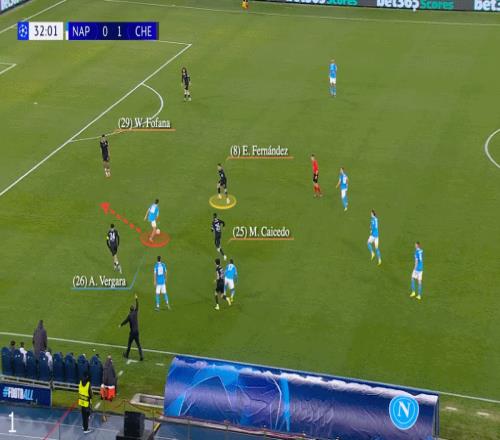 還有一月切爾西3-2戰(zhàn)勝那不勒斯比賽中主隊(duì)的首粒進(jìn)球。丟球時,凱塞多被落在球前,但費(fèi)爾南德斯位置正好可以封堵安東尼奧-韋爾加拉。然而他卻后退了一步,大概是擔(dān)心可能的傳球,讓韋爾加拉帶球直面韋斯利-福法納。凱塞多奮不顧身的鏟球未能救險,福法納被過,結(jié)果是進(jìn)球: