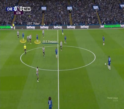 但在其他場合——最常見的是當(dāng)切爾西面對低位防守時——他們在場上的關(guān)系會變得更加混亂,因?yàn)樗麄儗で笳紦?jù)相同的空間。紐卡最近在斯坦福橋1-0獲勝就是很好的例子: