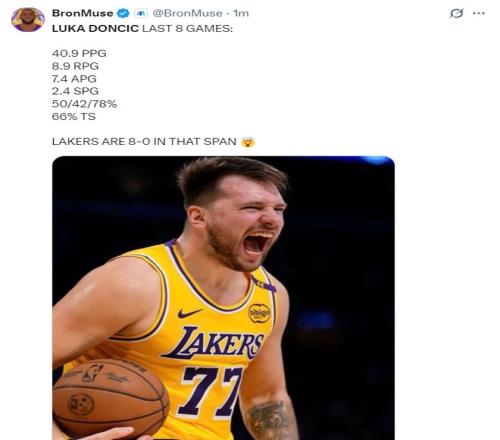 東契奇引全美熱議:八連勝場均41+9+7湖人已存雙山羊9次50+全勝