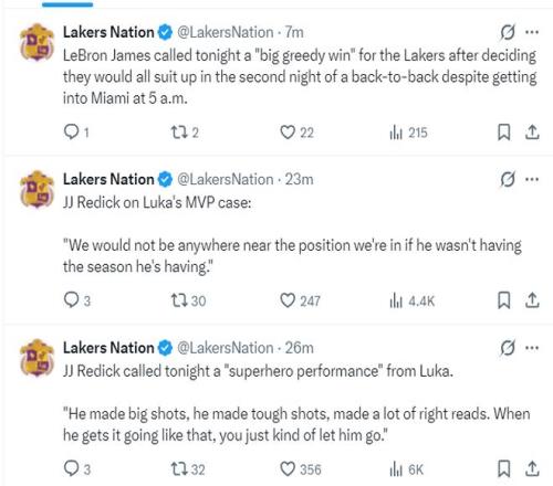 美媒轉(zhuǎn)推湖人盛贊東契奇X詹姆斯后寫道:詹姆斯/東契奇已是雙山羊。