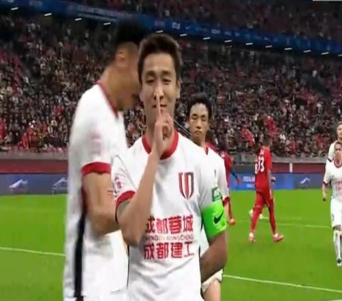 第27分鐘,韋林頓突入禁區(qū)被阮奇龍拉倒,主裁判判罰點(diǎn)球,韋世豪主罰點(diǎn)球破門(mén),1比0!成都蓉城取得領(lǐng)先。進(jìn)球之后,韋世豪對(duì)著鏡頭做出閉嘴動(dòng)作。