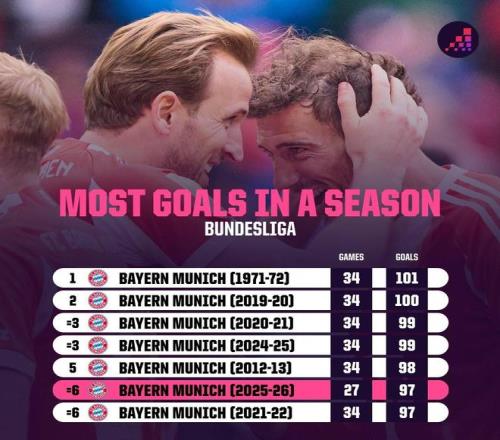 6 拜仁 2025-26賽季 27場(chǎng)97球