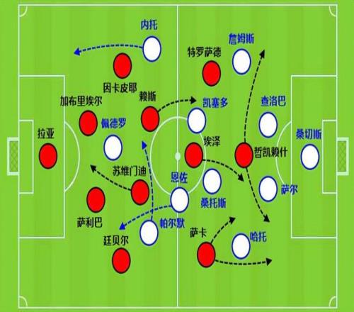 阿森納中鋒哲凱賴什作為橋頭堡類型的攻擊手,他自己得分效率不高,不過活動范圍大。通過哲凱賴什突前或者拉邊,帶來后排前插,也是阿森納的一個殺招。