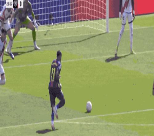 第57分鐘,巴薩快發(fā)前場任意球,費(fèi)蘭·托雷斯第一時(shí)間將球掃到門前,球速相當(dāng)快,拉菲尼亞飛鏟都沒能碰到皮球。