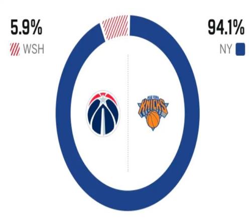 賽前,美媒ESPN對(duì)本場(chǎng)比賽進(jìn)行了勝率預(yù)測(cè),奇才隊(duì)勝率僅有可憐的5.9% ,尼克斯勝率則高達(dá)94.1% , 這差距真是懸殊。