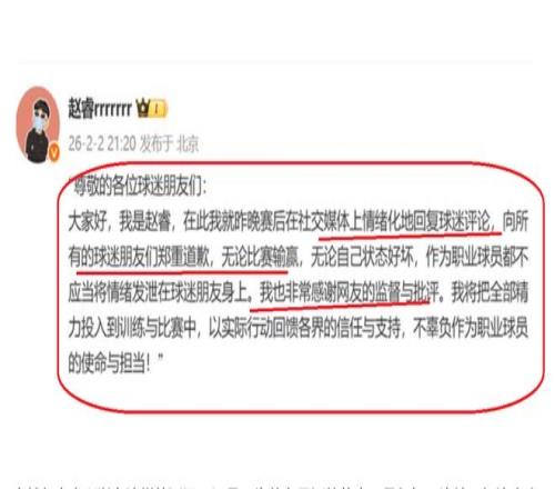 2月2日,晚上9點!北京隊球員趙睿,通過網(wǎng)絡(luò)平臺發(fā)文,正式向球迷進行道歉!