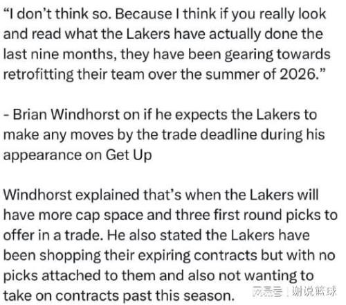 就連包括溫德霍斯特在內(nèi)的其他記者,也覺得湖人之所以不想留住詹姆斯,是因為放棄在這個賽季爭冠可能性。所以哪怕截止日前,湖人都不太可能做出有效補(bǔ)強(qiáng),湊合把這個賽季給熬完,等今年夏天詹姆斯合同到期,雙方分道揚(yáng)鑣以后,湖人可以騰出薪資空間。到時候管理層工作很多,比如需要給里夫斯開出新合同,八村塁、艾頓和斯瑪特等人,可能面臨續(xù)約事宜,詹姆斯的未來去向,同樣會成為焦點(diǎn)。