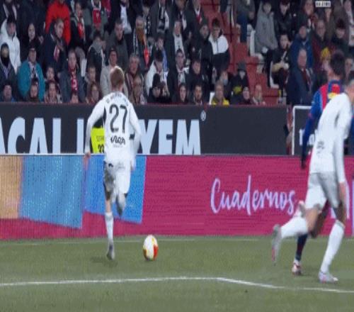 第44分鐘,霍安-加西亞抱著球出底線鼓勵(lì)阿勞霍,送對(duì)方角球