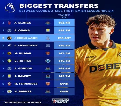 德轉(zhuǎn)統(tǒng)計英超除BIG6外歷史最貴交易:紐卡6140萬歐簽埃蘭加第1