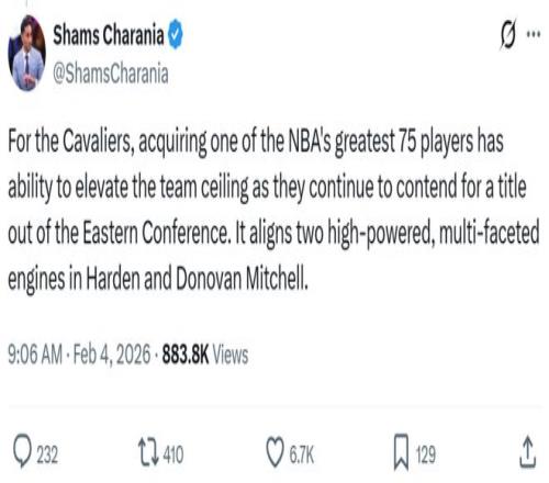正如名記Shams所說:“對于騎士隊(duì)來說,引進(jìn)哈登這樣一名75大巨星顯然能夠提高球隊(duì)上限,他與米切爾的聯(lián)手將讓球隊(duì)有資格在東部競爭冠軍?!?/p>