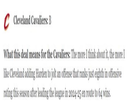 哈登1換2交易評分出爐兩隊(duì)雙贏!騎士交易后可進(jìn)可退獲B評分,快船困境中找到兩全之策同樣拿下不錯(cuò)的B-評分。