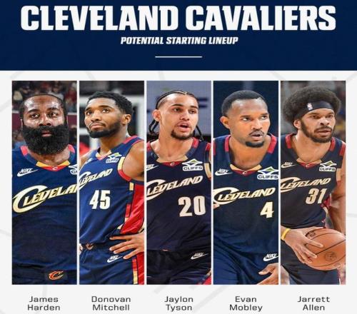 騎士現(xiàn)在的陣容深度非常強(qiáng)大。他們可以圍繞四大核心球員哈登、米切爾、埃文·莫布利和賈萊特·阿倫搭配主要輪換球員。另外一個首發(fā)球員可能是二年級球員杰隆·泰森。