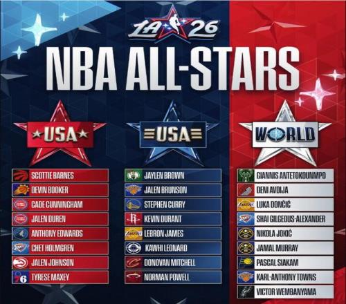 北京時間2月4日,NBA官方公布了2026全明星賽的分組,其中,詹姆斯、杜蘭特和庫里同在美國條紋隊。