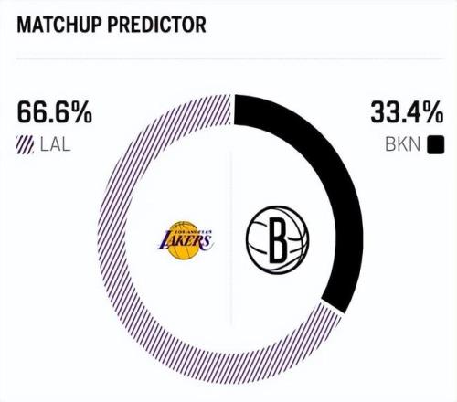賽前,美媒ESPN對本場比賽進(jìn)行了勝率預(yù)測,湖人隊勝率高達(dá)66.6% ,籃網(wǎng)勝率則僅有33.4% ,對比明顯。