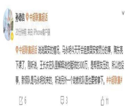 剛剛,媒體人孫德信在個人社交賬號上發(fā)文稱,北京國安新任體育總經(jīng)理馬永明今天開會追責(zé)了國安被罰分一事,最終結(jié)果是領(lǐng)隊隋東亮下課,而王長慶因在解釋之后則沒有事。此外,孫德信稱還有一位助理教練和隊醫(yī)也要被拿下。