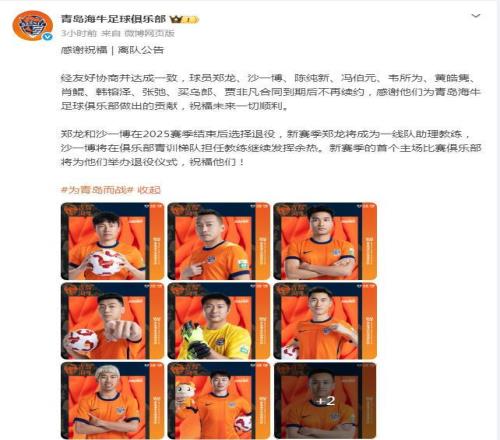 2月4日,青島海牛俱樂部官宣,鄭龍、沙一博、陳純新、馮伯元、韋所為、黃皓雋、肖鯤、韓镕澤、張弛、買烏郎、賈非凡合同到期不再續(xù)約,海牛俱樂部祝他們未來一切順利。鄭龍、沙一博選擇退役,其中,鄭龍將成為海牛一線隊助理教練,沙一博將在俱樂部青訓梯隊擔任教練發(fā)。