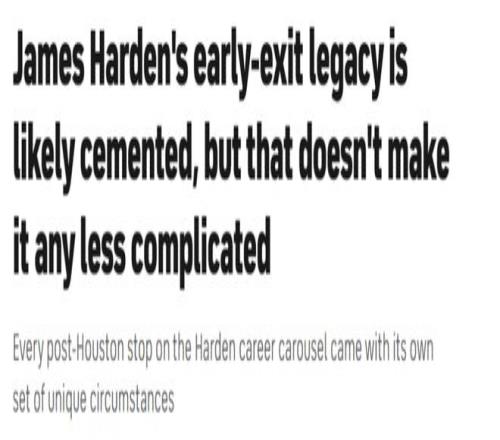 這一次的目的地是克利夫蘭——在快船的征程未能如愿后,在與費(fèi)城不歡而散后,在布魯克林短暫停留后。頻繁改換門庭、季后賽早早出局,這些都將成為哈登職業(yè)生涯履歷中無(wú)法抹去的印記。單從紙面來(lái)看,他離開火箭后的這段生涯軌跡,確實(shí)難逃外界的詬病。