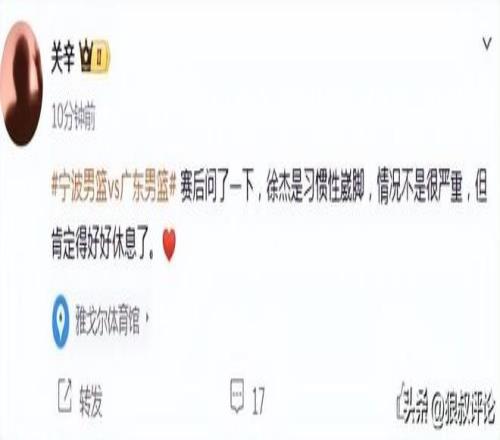 當(dāng)時(shí)廣東體育記者關(guān)辛發(fā)文報(bào)道,徐杰是習(xí)慣性崴腳,情況不是很嚴(yán)重,但肯定得好好休息了。