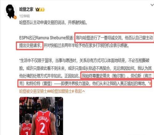 聯(lián)手米切爾后,哈登正式發(fā)聲:加盟騎士很興奮,但我沒有申請交易