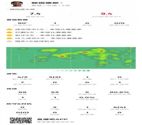 賴因德斯本場數(shù)據(jù):1進球5關鍵傳球3攔截2過人成功,評分7.4