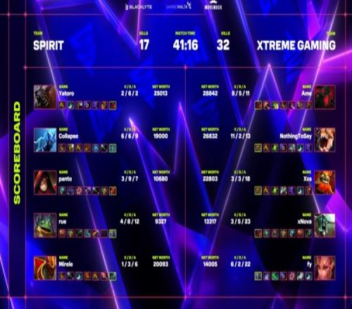 中期Spirit吃掉第一代肉山,不朽之守護(hù)給到Y(jié)atoro。下路團(tuán)戰(zhàn),Yatoro盾被打掉,哥哥影魔與NTS獸輸出拉滿,NTS拿到雙殺,XG打出3換3。隨后二代肉山團(tuán),Yatoro拍拍開團(tuán)就被秒殺,但哥哥有鄂北Collapse雷澤秒殺,NTS獸踏平rue朗戈,XG打出1換4,經(jīng)濟(jì)領(lǐng)先3k。