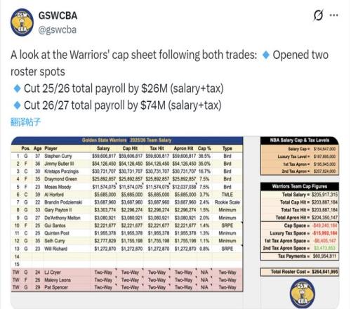 勇士在去年夏天引進(jìn)了霍福德,如今又將波神招致麾下,這樣一來(lái)綠軍2023-24賽季奪冠時(shí)的兩大中鋒都來(lái)到了勇士。有些遺憾的是,這兩位大個(gè)子的狀態(tài)比兩年前又下滑了一些。勇士是不可能指望靠這樣的陣容去沖擊冠軍的。勇士這筆交易背后的一個(gè)目的是省錢。通過(guò)這筆交易,勇士在本賽季共計(jì)節(jié)約2600萬(wàn)美元薪水和奢侈稅,能在下賽季節(jié)約7400萬(wàn)美元薪水和奢侈稅,合計(jì)預(yù)計(jì)節(jié)約1億美元。