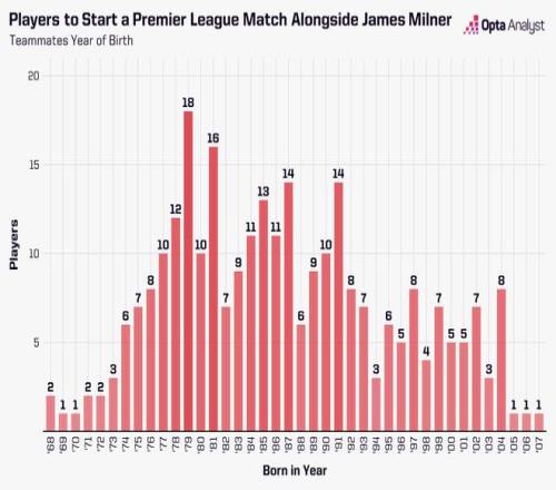 米爾納在英超聯(lián)賽中擁有281名不同的隊友,曾與出生于1968年至2007年每年的球員并肩作戰(zhàn)。