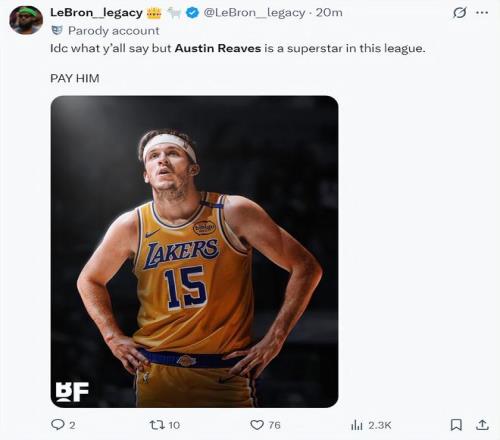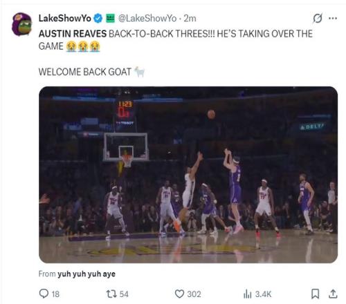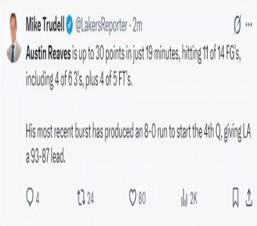 奧斯汀-里夫斯實在是太出色了,末節(jié)開場湖人還在落后,但在短短1分06秒的時間里里夫斯一人打出了8-0的攻勢直接幫助湖人反超,湖人隊記邁克-特魯戴爾都覺得不可思議。