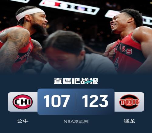開場后英格拉姆就展現(xiàn)出不錯(cuò)狀態(tài),帶領(lǐng)猛龍迅速取得領(lǐng)先,博伊爾斯在內(nèi)線也表現(xiàn)相當(dāng)活躍,河村勇輝替補(bǔ)登場后連續(xù)助攻隊(duì)友拿分。第二節(jié)兩隊(duì)大打?qū)?zhàn),英格拉姆手感依舊火熱,公牛的新援西蒙斯和亞布塞萊也表現(xiàn)神勇,兩隊(duì)一直圍繞10分左右拉鋸,半場過后猛龍領(lǐng)先7分。易邊再戰(zhàn),公牛率先發(fā)難抹平分差,猛龍立馬回敬一波10-0攻勢重新建立領(lǐng)先,此后雖然公牛繼續(xù)努力追分,但猛龍一直保持兩位數(shù)優(yōu)勢。最后一節(jié)兩隊(duì)進(jìn)攻效率都有所下降,公牛未能再度追上比分,最終猛龍123-107送公牛3連敗。