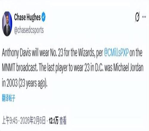 北京時(shí)間2月6日,奇才和獨(dú)行俠的交易官宣,安東尼-戴維斯正式成為一名奇才球員。奇才隊(duì)記Chase Hughes報(bào)道稱,濃眉來到奇才將改穿23號(hào)球衣,而上一位在奇才穿23號(hào)球衣的球員,已經(jīng)追溯到23年前的邁克爾-喬丹(2003年)。