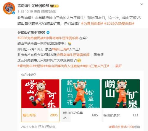 值得一提的是,青島海牛的胸前廣告已經呼之欲出,并確定為“嶗山三絕”(嶗山可樂、嶗山白花蛇草水、嶗山礦泉)中的一款,目前這三款產品正在火熱打榜中,相信很快會有結果。