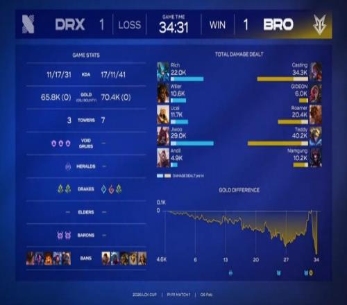 中期BRO聽牌煉金龍魂,中路團(tuán)戰(zhàn)Jiwoo霞先拿雙殺,teddy帶領(lǐng)上輔反打最終2換3。此后大龍團(tuán),Wiiler皇子中路繞后火鍋扣住BRO雙C,DRX打出1換2吃掉大龍,扳平前期經(jīng)濟(jì)劣勢。