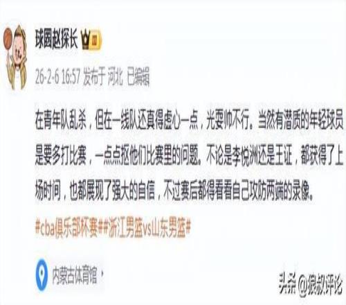媒體人趙探長發(fā)文點(diǎn)評(píng):在青年隊(duì)亂殺,但在一線隊(duì)還真得虛心一點(diǎn),光耍帥不行。當(dāng)然有潛質(zhì)的年輕球員是要多打比賽,一點(diǎn)點(diǎn)摳他們比賽里的問題。