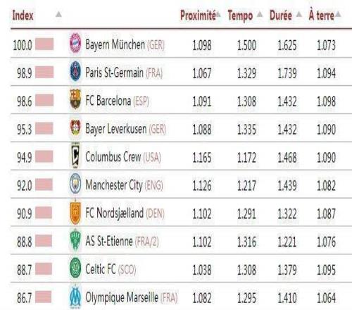 知名數(shù)據(jù)評測機(jī)構(gòu)足球天文臺(CIES)基于合作伙伴Impect的數(shù)據(jù),結(jié)合58個主流聯(lián)賽公布了全球最具“控球主導(dǎo)、傳控風(fēng)格”的球隊(duì)排名,拜仁以100分的基準(zhǔn)分登頂榜首,巴黎巴薩分列二三位。數(shù)據(jù)核心排名標(biāo)準(zhǔn)通過以下四項(xiàng)技術(shù)指標(biāo)綜合評定:傳球距離(越短越好)、控球階段的傳球速度、平均單次控球時長,以及在前場三分之一區(qū)域,膝蓋以下接球的百分比。排名第一的拜仁獲得了100分的綜合評分(即其他球隊(duì)以拜仁的100分作為綜合指標(biāo)),巴黎、巴薩作為二、三名分獲98.9和98.6分。第4-10名分別為:勒沃庫森(德甲)、哥倫布機(jī)員(美職聯(lián))、曼城(英超,92分)、北西蘭(丹麥超)、圣埃蒂安(法乙)、凱爾特人(蘇超)、馬賽(法甲)。11-20名分別為:布拉加(葡超)、博德閃耀(挪超)、吉達(dá)聯(lián)合(沙特聯(lián))、皇馬(西甲,84分)、哈馬比(瑞典超)、圣地亞哥(美職聯(lián))、錫爾克堡(丹麥超)、利物浦(英超,81.9分)、洛杉磯FC(美職聯(lián))和埃爾切(西甲)