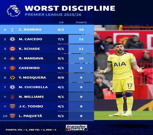 賽后來自德轉(zhuǎn)的統(tǒng)計(jì)指出,克里斯蒂安-羅梅羅是本賽季至今英超聯(lián)賽中拿牌數(shù)量最多的球員,21場(chǎng)比賽這名阿根廷中衛(wèi)一共吃到了8張黃牌和2張紅牌。