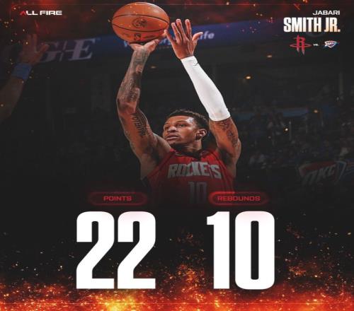 小賈巴里-史密斯是奇兵,鏖戰(zhàn)43分14秒,12中5,三分7中3,罰球11中9,拿到22分10籃板1搶斷1蓋帽0失誤,他多次在雷霆內(nèi)線制造殺傷,當(dāng)小賈拿到15+后火箭隊(duì)21勝7負(fù)。