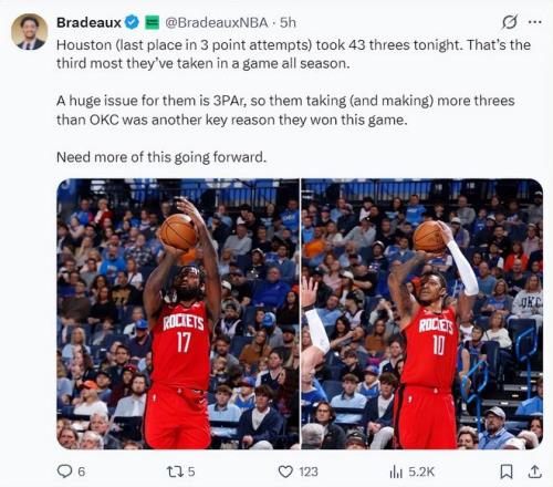 火箭記者Bradeaux寫道:火箭隊(duì)本賽季在三分出手方面是聯(lián)盟墊底,但此役出手43個(gè)三分球,這是火箭本賽季三分出手最多的一場(chǎng)(命中15球)。對(duì)于火箭來(lái)說(shuō)三分球出手次數(shù)是一個(gè)重要的指標(biāo),最終他們比雷霆多進(jìn)1個(gè)三分就是贏球關(guān)鍵,未來(lái)火箭應(yīng)該多出手一些外線。
