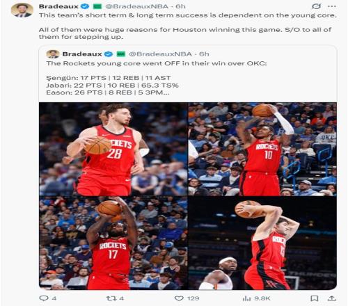 他寫道:火箭隊(duì)的當(dāng)下的成功與未來(lái)的成功都是依靠這支球隊(duì)中的年輕核心,他們每個(gè)人都是休斯頓贏得比賽的重要因素,感謝他們所有人都挺身而出。