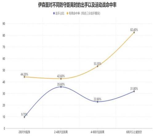 同時,伊森本賽季面對2英尺內(nèi)的貼身防守時的出手較少并且有效命中率較低,但隨著對手的防守距離越遠(yuǎn)他的有效命中率也就越高,這意味著雖然他面對嚴(yán)防時的攻堅硬解能力不足,但只要對手給他出手空間那么他就有很高效的得分產(chǎn)量以及效率,而面對6英尺以上被放空時他的三分球達(dá)到了聯(lián)盟最優(yōu)級別:
