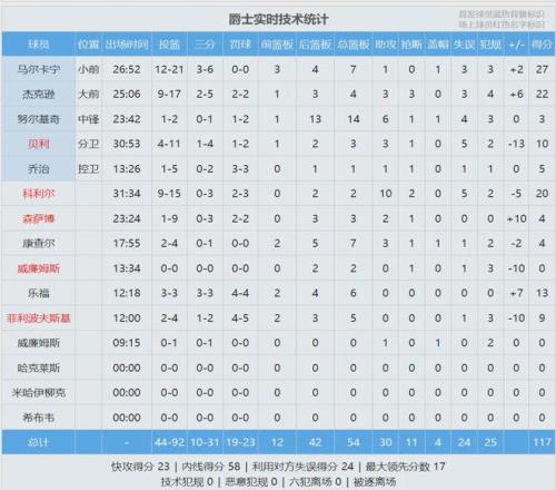 再來(lái)看看四節(jié)比分(爵士在前):30-33、35-21、29-33、23-33。大家可能發(fā)現(xiàn)一個(gè)問題,爵士第四節(jié)崩盤了,而且兩個(gè)核心馬爾卡寧和3J出場(chǎng)都不到27分鐘。沒錯(cuò),第三節(jié)還剩3分24秒,馬爾卡寧被換下,當(dāng)時(shí)爵士尚且領(lǐng)先7分。